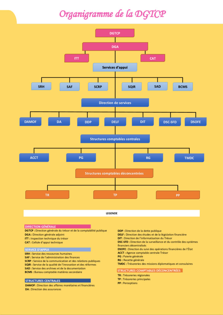 La Direction générale du trésor et de la comptabilité publique a pour organigramme :